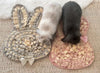 Our Story: One of the reasons we decided to create these is we have a bonded pair and they eat at a different pace. Our Cosmo eats slower and often tries to catch up to Rosalie when we serve them together. One time he almost choked, so we knew we needed to find a way to slow down his eating. We decided to give Rosie and Cosmo each their own snuffle mat. Now, they are both able to eat at their own pace as they both take time to forage on their own mat instead of just competing and trying to steal each others pellets. They both also have the cutest flops after their forage time as you know....it's a lot of hard work lol. These are a decent size for bonded pairs to share and also a great accessory to add to the buns space to make it more fun. After all, it's no secret that us bun-parents love to collect all the bunny shaped decor we can!